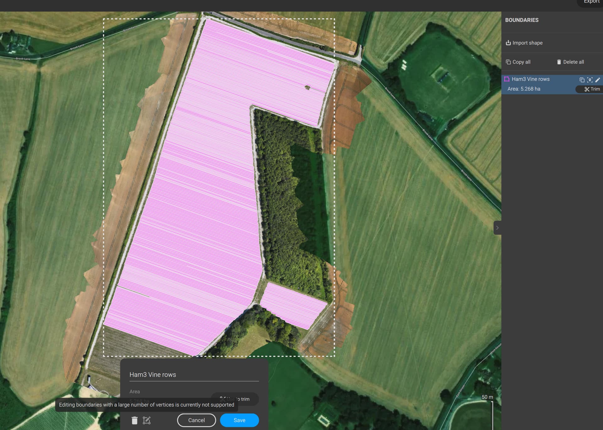 So I have hit the limit of sub-polygons, almost completed the field. This is irritating. I can’t even edit to delete some of the sub-polygons in order to split the vine block into two areas. I’ve spent hours on this and hit a brick wall. Now I have to give the client one large report and a ridiculous little one covering just 37 rows!