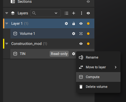 The imported LandXML is the base surface to calculate the volume. Once the LandXML is imported into PIX4Dsurvey, it creates a new layer with the file, then you can compute the volume using the “Compute” button in the toolbar or doing clicking on Compute inside the geometry actions button
